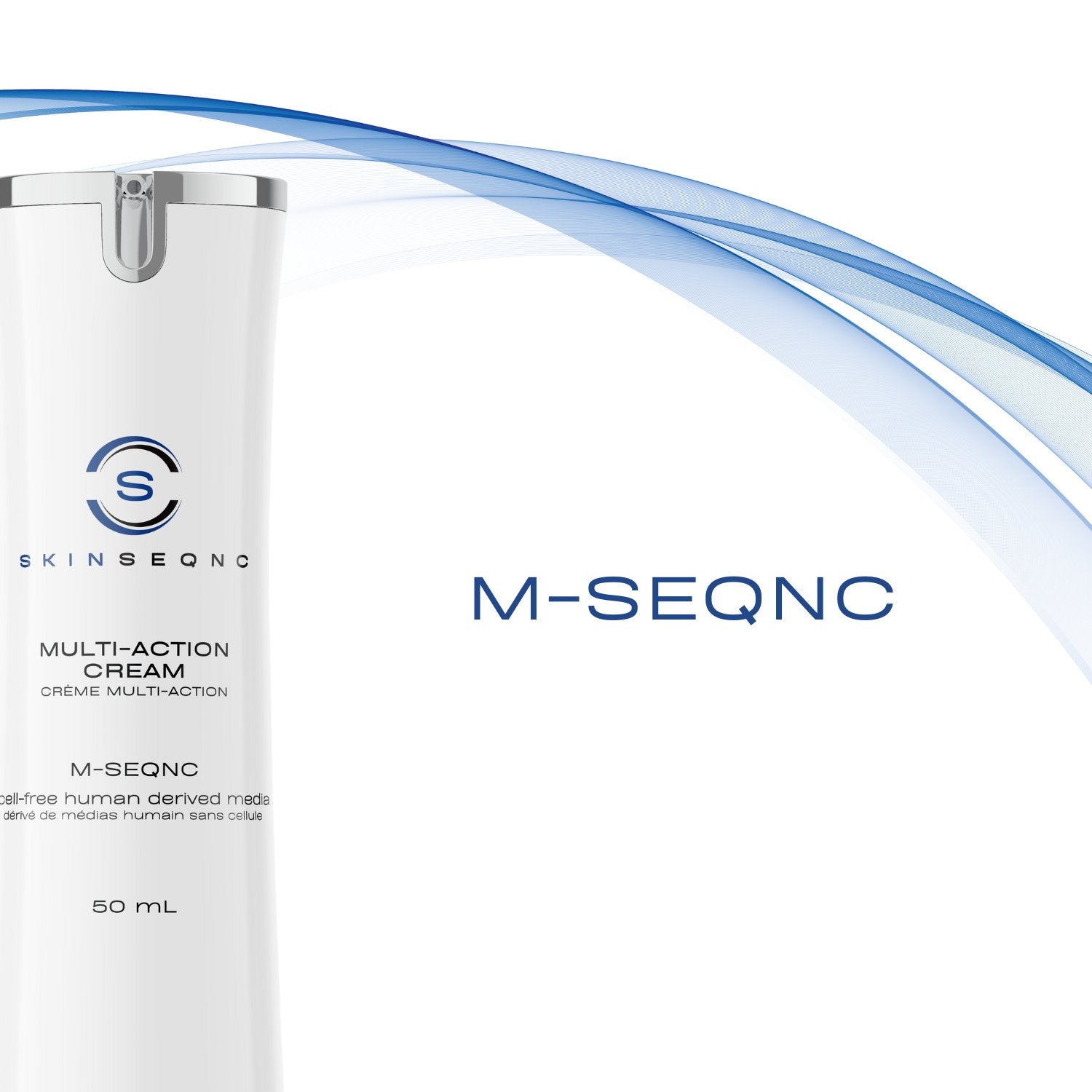 M-SEQNC (Media-Sequence) is a revolutionary cosmeceutical innovation that harnesses cell-free conditioned media derived from human umbilical cord mesenchymal stem cells. This complex mixture contains microvesicles, cytokines, peptides, and a full spectrum of growth factors, to enhance fibroblast functionality, accelerate cell proliferation, and promote deep skin regeneration.