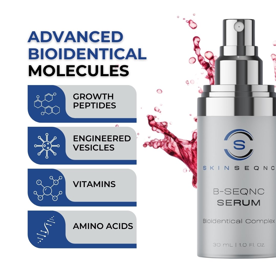 B-SEQNC BioIdentical Complex is a revolutionary, proprietary formula that blends advanced biotechnology with the forefront of skincare innovation. Engineered with precise concentrations of bioidentical molecules—including nourishing peptides, growth peptides, amino acids, and essential nutrients—this powerful complex mirrors the skin’s natural biological processes, stimulating deep cellular renewal and restoration. Each product infused with our Bioidentical Complex delivers targeted, clinically observed rejuvenation, visibly improving skin elasticity, texture, and radiance.