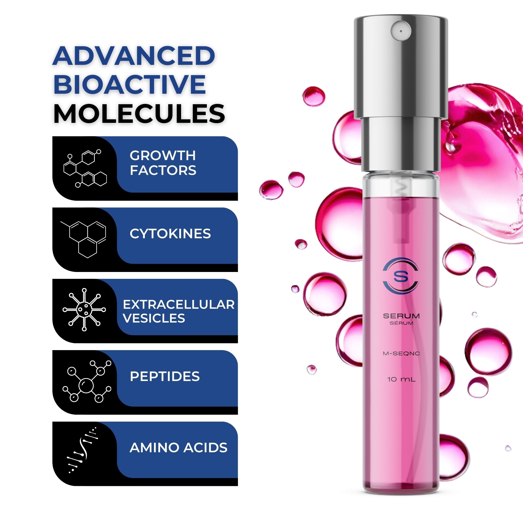 Each component of the M-SEQNC Serum has its ability to support and enhance the skin’s natural rejuvenation processes. The growth factors and cytokines are pivotal in stimulating the skin cells, encouraging new cell growth, and repairing damaged tissues, thereby enhancing the skin's overall texture and reducing visible signs of aging. The peptides and extracellular vesicles work synergistically to improve communication between cells, ensuring that skin remains resilient and functions optimally.